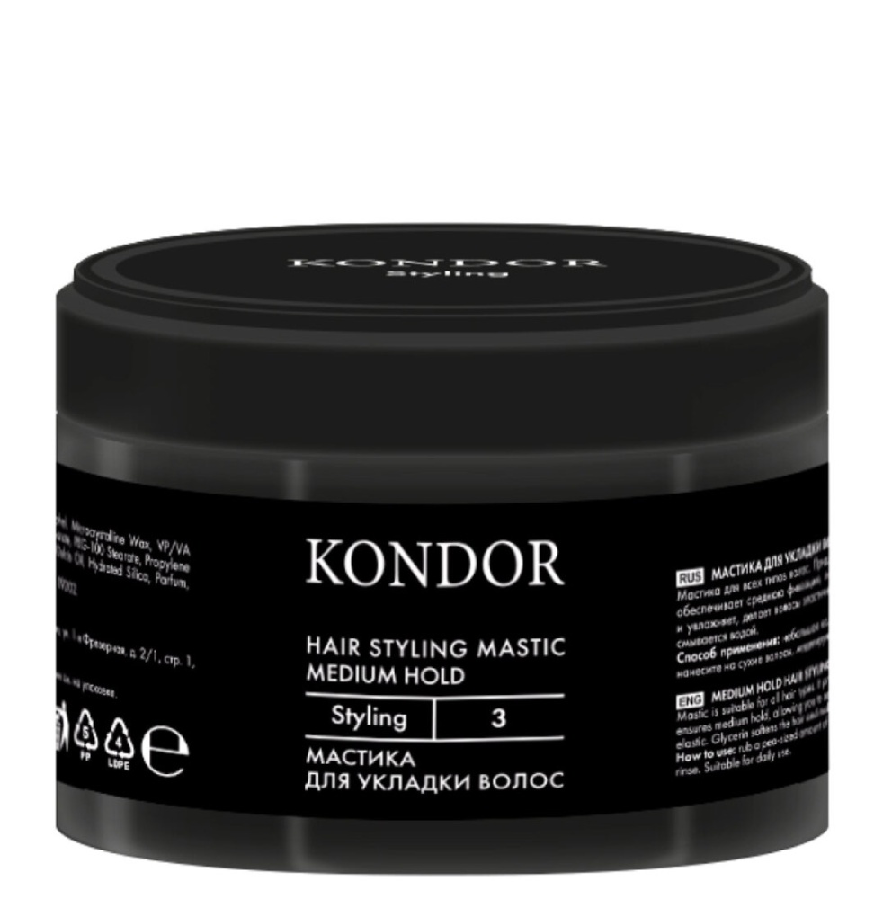 Мастика для всех типов волос. Придает легкую текстуру и естественный блеск без эффекта утяжеления. Пчелиный воск в составе обеспечивает среднюю фиксацию, позволяя моделировать и изменять форму укладки на протяжении дня. Масло миндаля питает и увлажняет, делает волосы эластичными. Глицерин смягчает и добавляет послушность. Ланолин защищает от пересыхания. Легко смывается водой.