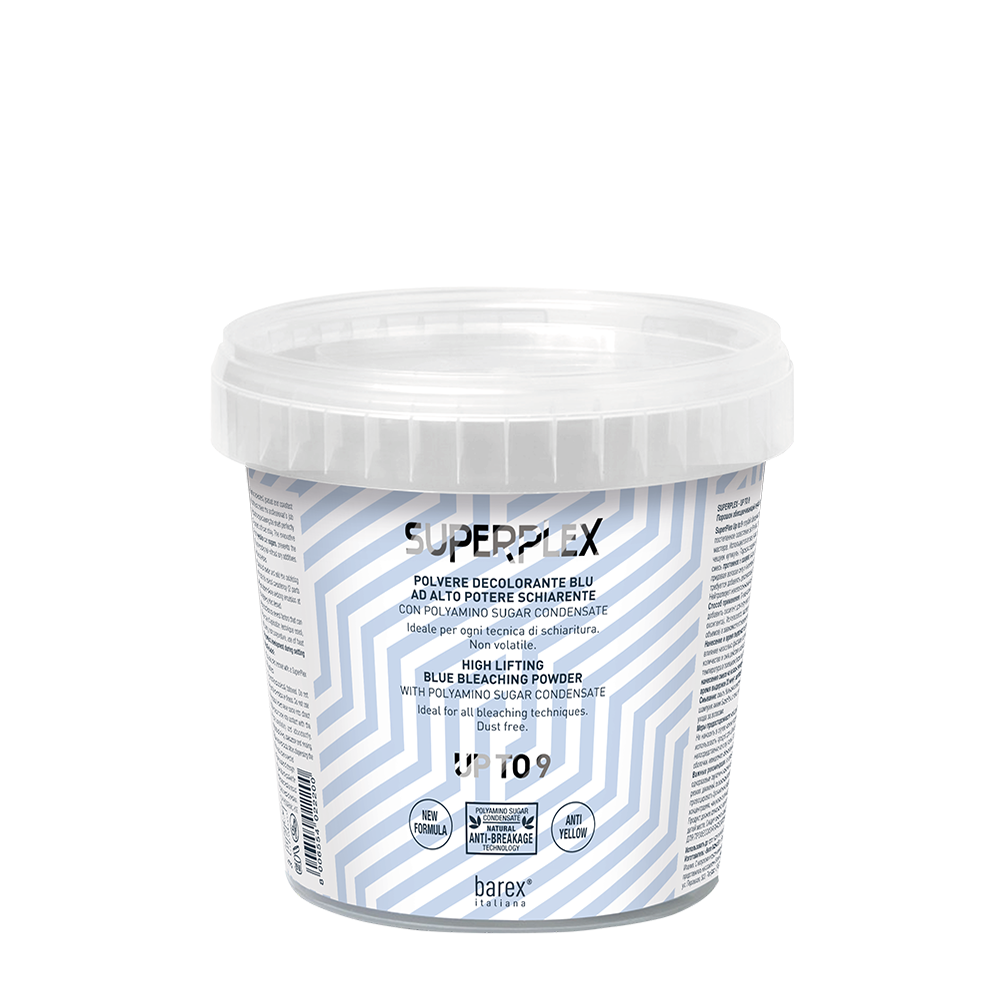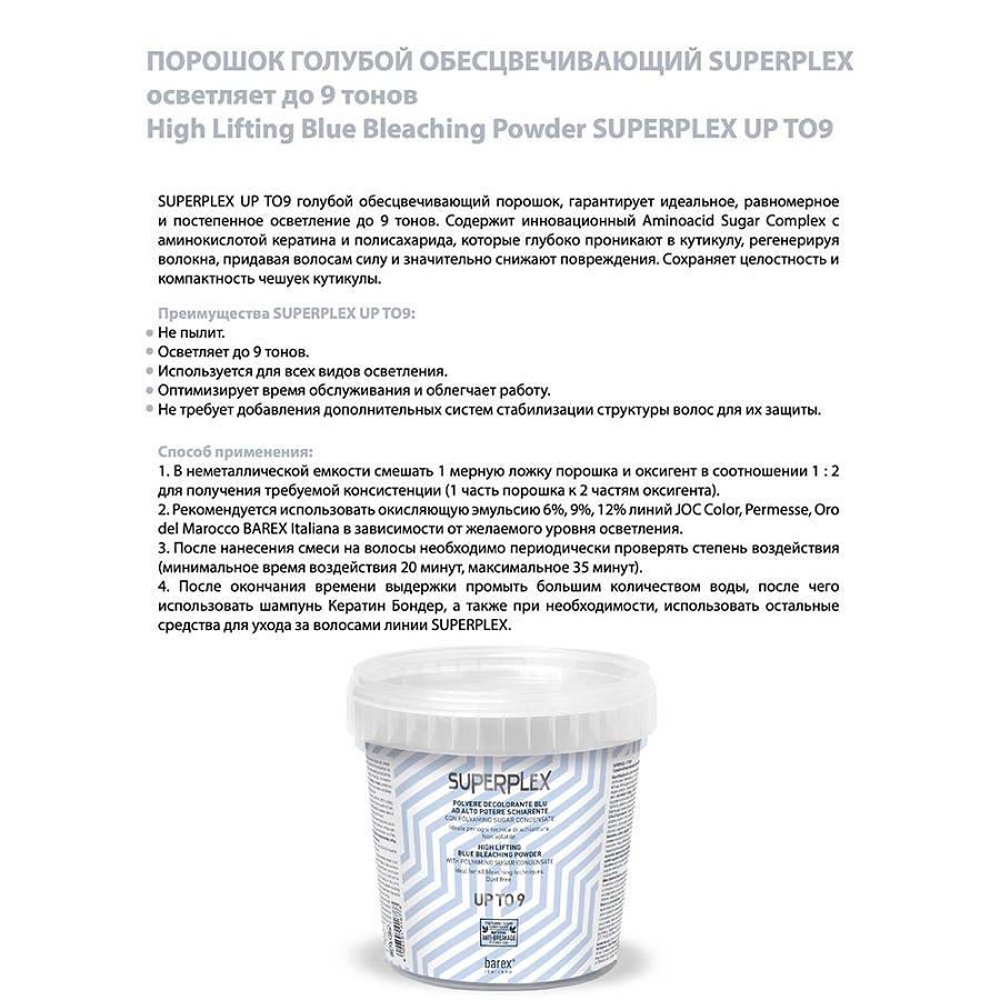 SUPERPLEX UP TO9 голубой обесцвечивающий порошок, гарантирует идеальное, равномерное и постепенное осветление до 9 тонов. Оптимизирует время обслуживания и облегчает работу мастера. Используется во всех техниках осветления. Сохраняет целостность и компактность чешуек кутикулы. Содержит инновационный комплекс Polyamino Sugar Condensate смесь протеинов и сахаров, которые глубоко проникают в кутикулу, регенерируя волокна, придавая волосам силу и значительно снижают повреждения. Благодаря богатому составу не требуется добавлять дополнительных систем стабилизации структуры волос для их защиты. Нейтрализует нежелательные желтые оттенки.