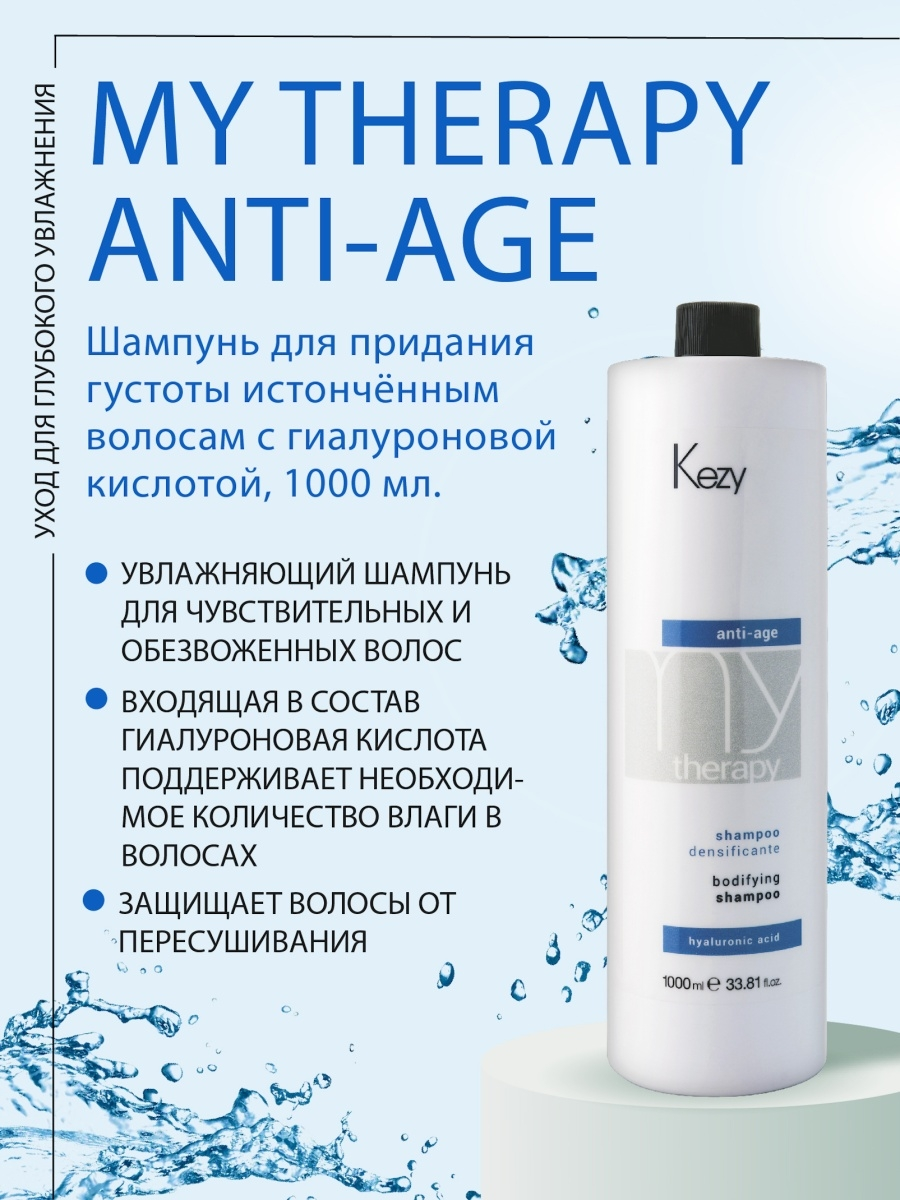 Увлажняющий шампунь для чувствительных и обезвоженных волос. Входящая в состав гиалуроновая кислота поддерживает необходимое количество влаги в волосах, защищая тем самым их от пересушивания.